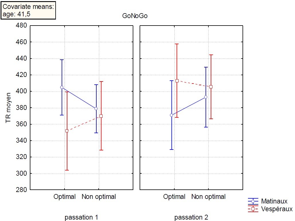 Nous avons effectué une analyse de la variance à mesures répétées pour le TR moyen, le pourcentage d’appuis intempestifs et le TR moyen post-X avec un facteur intra-groupe Optimalité (moment de test optimal vs. non-optimal) et deux facteurs inter-groupes Chronotype (matinal vs. vespéral) et ordre de Passation de la condition optimale (lors de la 1ère vs. lors de la 2nde passation), avec l’âge en covariée.