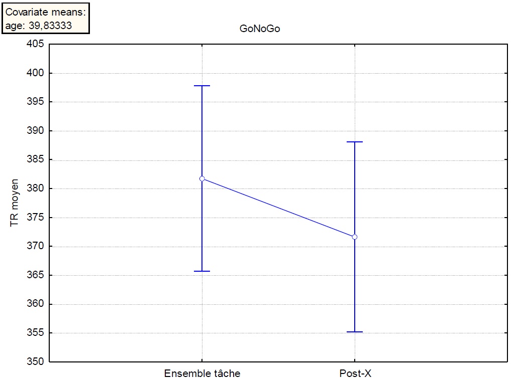 Pour la tâche GoNoGo, des analyses séparées ont été effectuées sur le temps de réaction (TR) moyen, le pourcentage d’appuis intempestifs, le coefficient de variation et le TR moyen post-X. Une analyse portant sur la comparaison TR moyen et TR moyen post-X a également été réalisée. Les sujets 16,20 et 35 ont été écartés des analyses de TR moyen et de TR moyen post-X (leur performance étant au-delà de 2 écart-types).