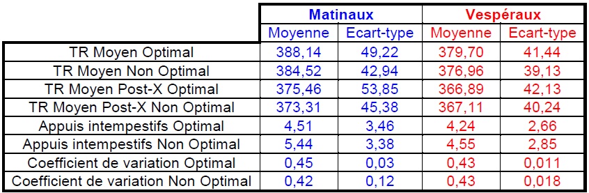 Le tableau 4 ci-dessous reprend les moyennes et écart-types des sujets matinaux et vespéraux pour les différentes mesures de la tâche GoNoGo.