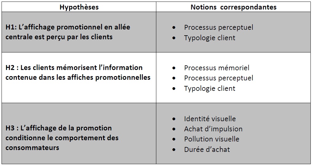 Les hypothèses ainsi que les notions marketing associées sont récapitulées dans le tableau ici présent :