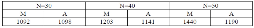 A=1141), the results are even reaching a difference of 250 unities of time when N=50(158).