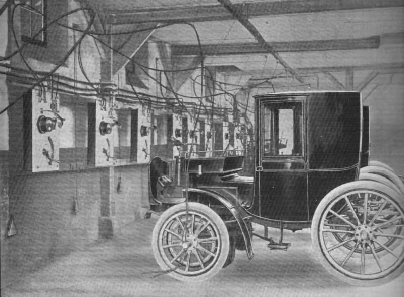 Ci-dessous, une station de recharge électrique destinée aux flottes des sociétés de taxis qui exploitaient les « électromobiles » Krieger à Paris en 1898.