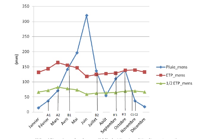 – B1 – B2 et B’1 – B’2 = périodes humides : la pluviosité est supérieure a l’ETP