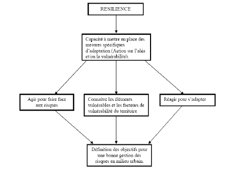 Ainsi on considérera dans le cadre de cette étude que la résilience d’une ville tient dans la capacité des Collectivités Territoriales Décentralisées et des services déconcentrés de l’Etat à mettre en place des mesures spécifiques, qu’elles agissent sur l’aléa ou sur la vulnérabilité, dans une perspective de développement durable. D’autant plus que traiter de la résilience c’est admettre consciemment ou pas que l’aléa frappera quelque soit les mesures préventives. Dans cette perspective, la résilience des systèmes de vulnérabilité sera définie comme la capacité des acteurs de ce système à :