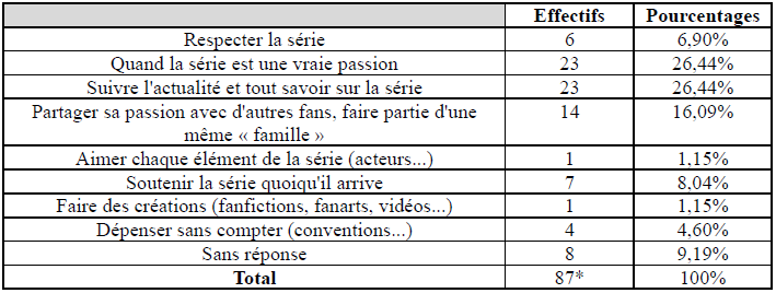 Comme le montre ce tableau, 26,44% des individus interrogés définissent leur condition comme le fait d’être « passionné » par la série, et comme le fait de tout savoir, en suivant l’actualité. Si de nombreuses représentations subsistent quant à la notion de « fan », les principaux intéressés se définissent comme des experts, et revendiquent uniquement cet aspect positif.