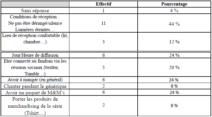Sachant qu’un public de téléspectateurs “lambda” a par définition, un attachement moins marqué pour une série en particulier, on peut penser que ses habitudes « propres » à la réception de ce programme trouveraient un pourcentage bien inférieur à celui-ci. Ceci souligne l’importance des rituels chez les publics de fans, et par extension : la place et l’importance que la série prend dans leur quotidien (le besoin de rituel apparaît parce que la série a une valeur spéciale). Cette question était suivie d’une réponse libre permettant aux fans de préciser leurs habitudes s’ils en avaient :