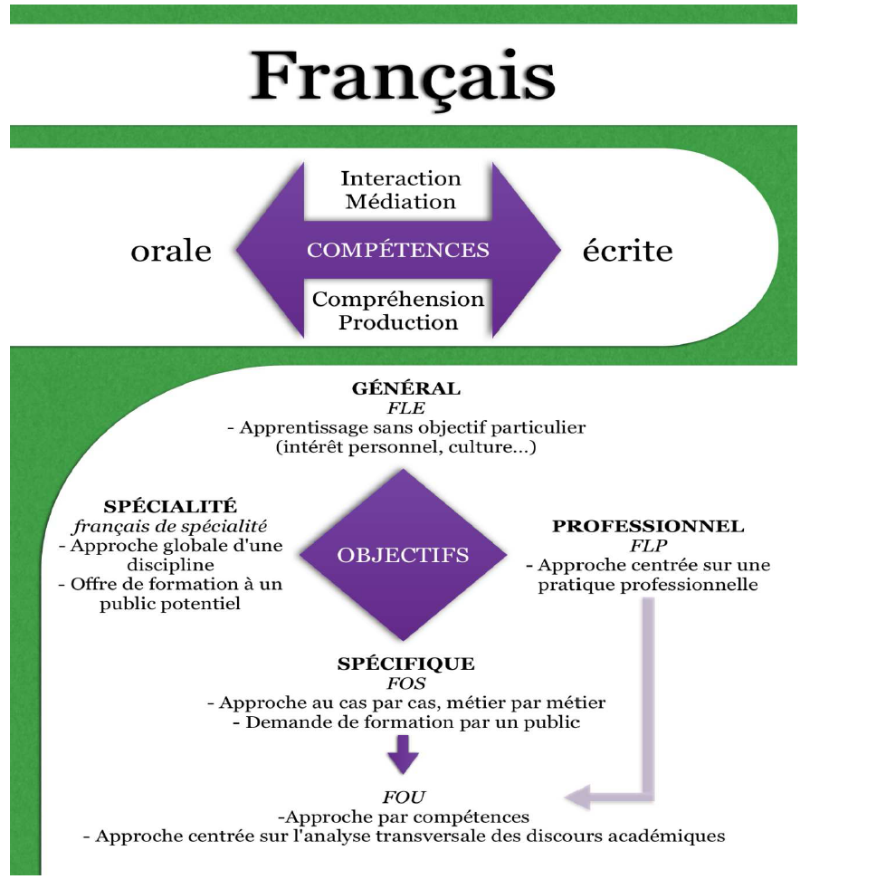 Établi à partir des différents courants que nous venons d’expliquer, le schéma suivant synthétise les différentes branches de la famille de l’enseignement du français avec objectif en fonction des quatre compétences du CERCL.
