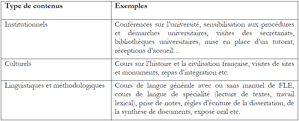 Lors de la conception d’une formation, le didacticien détermine des objectifs, des compétences et des contenus. Contrairement aux formations FLE « généralistes », qui adaptent des contenus progressifs en fonction des niveaux et des quatre compétences prédéterminées par le CECRL de la division des politiques linguistiques du conseil de l’Europe, les formations en FOU définissent en priorité des contenus, qui ne sont pas forcément en adéquation avec les critères du CECRL. Le tableau des contenus de formations proposé par Mangiante et Parpette montre bien que c’est l’objectif universitaire qui est privilégié.