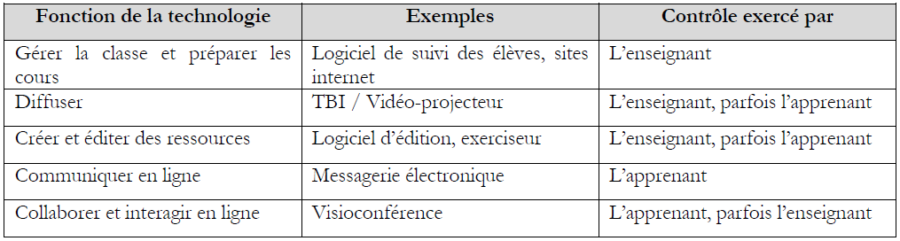Les TIC sont la réponse technologique à la FOAD étant donné que le site Compétice(19) définit les TIC comme « l’ensemble des moyens techniques permettant à la fois la communication entre acteurs distants, la diffusion/collecte d’informations, et l’animation des séquences de formation multimédia. » Suite à cette définition et aux travaux de Guichon (2012 : 43), nous voyons que les TIC sont une réponse technologique à la formation à distance et/ou un outil complémentaire à utiliser en classe puisqu’ils ont « des caractéristiques sociales en examinant les utilisations qu’elles occasionnent. » Afin de nous aider à mieux développer notre projet de formation hybride en FOU, nous reprenons le tableau de Guichon de la typologie des TIC selon leur fonction pour mieux cibler les différentes fonctions et possibilités offertes par les TIC :