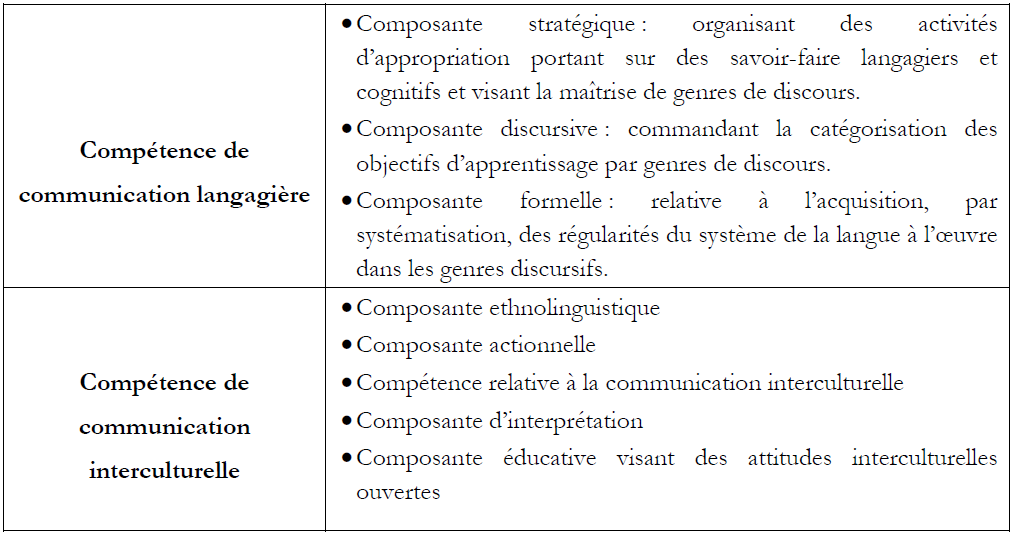 Aussi, un programme de formation en FOU s’intéresse particulièrement aux formes discursives spécifiques des interactions orales et écrites, ce qui nous amène à considérer le deuxième modèle de découpage des compétences de Beacco (2007 : 93) et à envisager une structuration adaptée à des groupes d’apprenants dont les besoins langagiers sont identifiables et analysables en terme de répertoire de genres de discours à acquérir en langue étrangère.