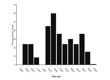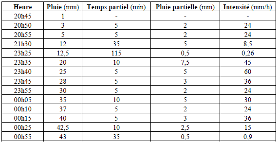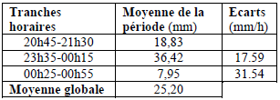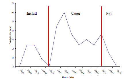 La figure 14 présente l’évolution de l’intensité pluviométrique et les phases de l’averse.