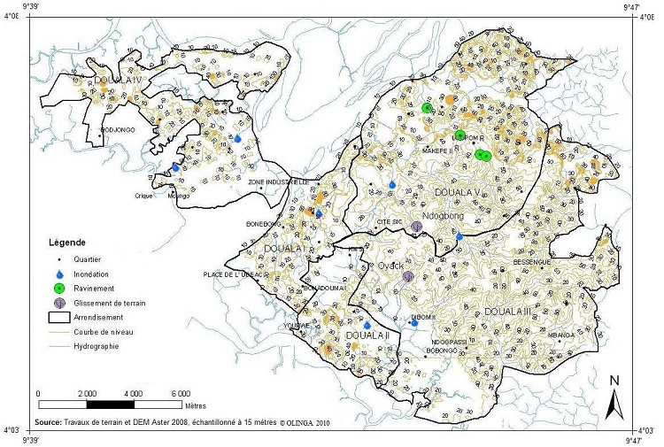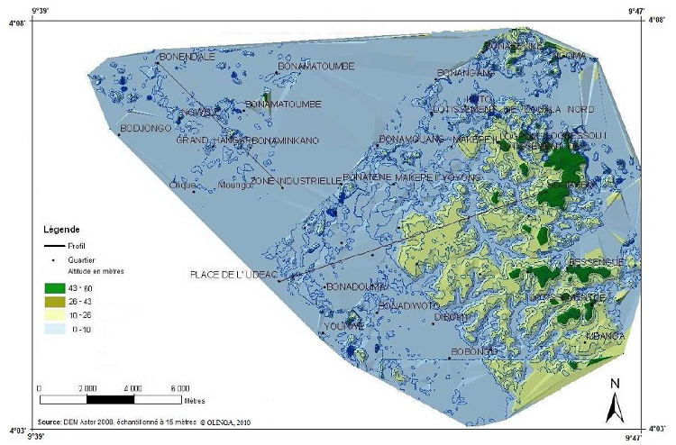 De l’analyse et l’interprétation du le modèle numérique de terrain et du profil topographique SE – NO de la ville de Douala qui va de Bonassama (SE) à Bonendale (NO), il en ressort que les secteurs concaves et quasi monotones qui concentrent les plus faibles altitudes (inférieures à 10 m à Bonabéri et inférieures à 15 m dans la partie Est de la ville), parfois investies par un habitat spontané et précaire sont l’apanage d’inondations plus ou moins fréquentes. Dans ces secteurs, la morphologie est telle que la rivière qui coule sur des formations meubles ne peut plus approfondir son chenal du fait de la pente presque nulle et les capacités d’incision du cours d’eau sont annihilées (Tchotsoua, Op.cit.).