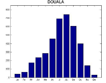 Une des originalités du régime pluviométrique de la station de Douala réside dans l’association d’une saison sèche de 3 mois, soit de Décembre à Février. Caractérisée par la modicité des précipitations et une longue saison abondante en précipitations qui s’étend pratiquement sur 9 mois, de Mars qui marque le début de la saison des pluies (Tchiadeu, 2000 in Tchiadeu et Ketchemen, 2009) à Novembre. La figure 12 représente le régime pluviométrique moyen mensuel de la ville de Douala sur la période 1951-2007.