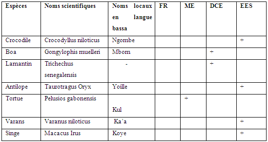 FR : Faible risque ; ME : Menacé d’extinction; DCE : En danger critique d’extinction, EES : Eteint à l’état sauvage