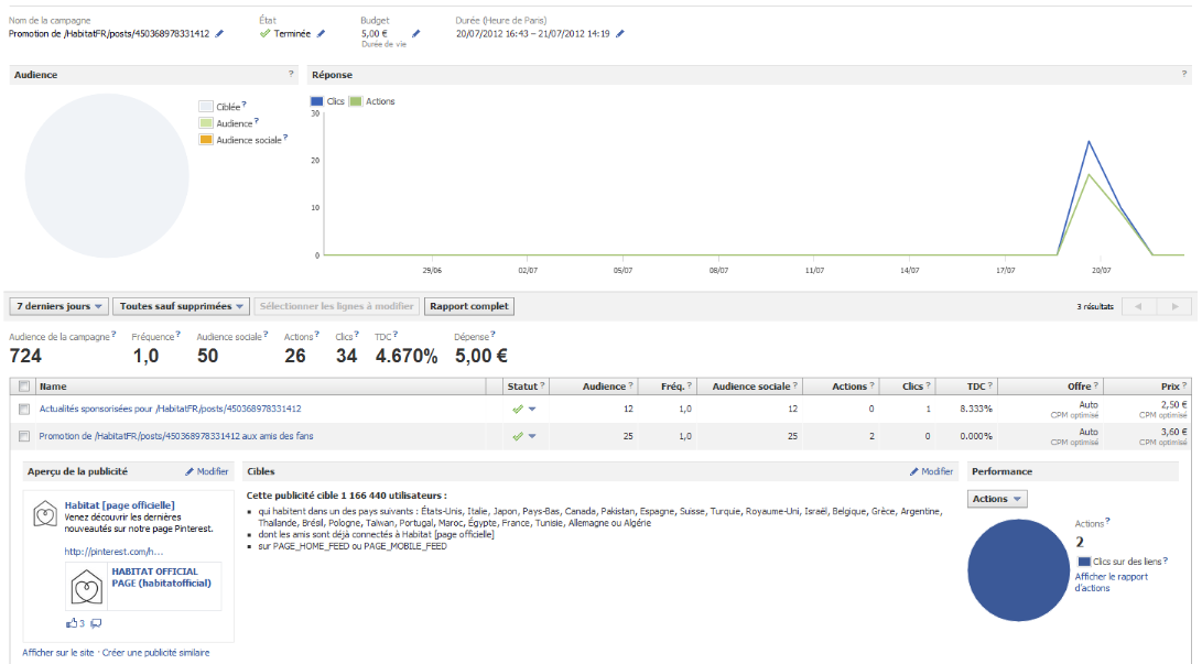 Exemple des résultats d’une publicité sur la page Facebook Habitat France pour promouvoir la nouvelle page Habitat sur le réseau social Pinterest.
