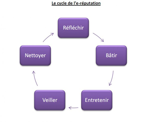 La gestion de sa E-réputation peut être une activité gourmande en temps. Cet axe stratégique se définit en 5 étapes :