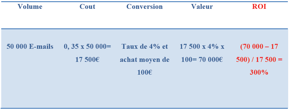 (Coût : 0,35 centimes par e-mail et taux de transformation par clients 4% avec un achat moyen de 100€ par client).