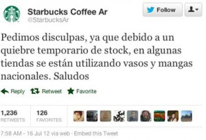 En effet, le Community manager de Starbucks en Argentine avait « tweeté » que les magasins subissaient une rupture de stock des mugs avec Logo ciglés du pays et allaient être remplacé momentanément par des mugs traditionnels des Etats-Unis.