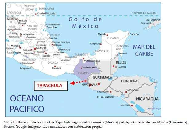 La frontière du Mexique avec le Guatemala est délimitée par le fleuve Suchiate et Usumascinta, entre les deux, « il y a environ 385 kilomètres de frontière terrestre, principalement des zones de montagnes et jungle » (ARMIJO CANTO, 2011, p.36). La situation de Tapachula, à proximité de l’océan Pacifique à une hauteur proche du niveau de la mer, lui donne une place stratégique dans l’état du Chiapas. C’est une ville importante pour aborder la thématique migratoire.