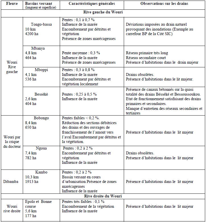 – Une deuxième zone à l’Est, aux pentes quasi-nulles constituant une zone d’épandage des crues dans un lit majeur plus vaste et marécageux, (Sous bassins sud du Tongo Bassa, Mbanya, Béssèkè, Bobongo, Mboppi, Epolo et autres bassin versants situés sur la rive droite du Wouri).