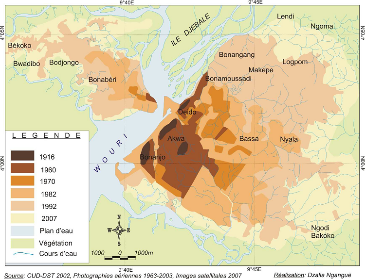 Ensuite par éclatement centrifuge dans tous les sens, notamment vers le Nord (Bepanda voirie, Yoyong, Makèpè Missokè) vers le Sud-est (Madagascar, Brazzaville, Soboum.). La progression du quartier Nylon s’est faite par la récupération de tous les espaces libres (Bilongué, Dibom, Ndogpassi). Enfin tout le long de la route Nationale N°3 (Douala-Yaoundé) et de l’axe urbain du Carrefour Ndokoti à Logbessou. De même que dans la sortie Ouest de la ville, le long de la route Nationale N°5 (Douala-Nkongsamba).