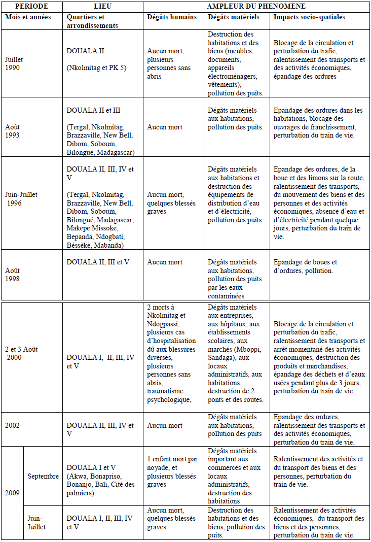 Tableau 24 : Inondations majeures enregistrées dans la ville de Douala de 1990 à 2009