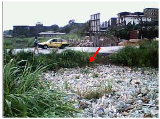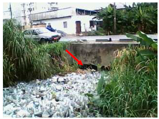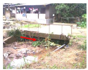 Les photos 3 et 4 mettent en évidence l’obturation du drain New Bell Sud (Chefferie Bonapriso) par les déchets solides, (Photo 3) et de la servitude de passage des eaux du drain en amont du Kondi, route de Ndokoti à PK10 (Photo 4). Les flèches en rouge indiquent les dalots et les buses d’écoulement des eaux. Il s’en suit habituellement le débordement du cours d’eau qui envahi environ 20 à 50 mètres de part et d’autre de ses berges en épandant les déchets sur la