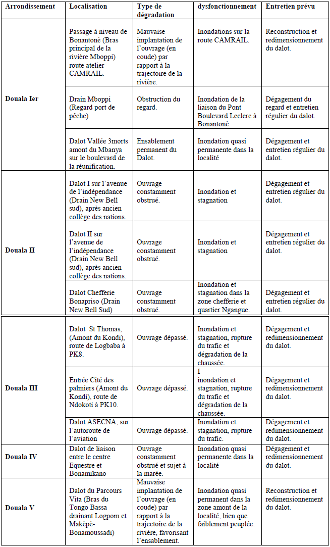 Le tableau 5 présente les ouvrages de drainage dont le dysfonctionnement est à l’origine des inondations dans la ville de Douala.