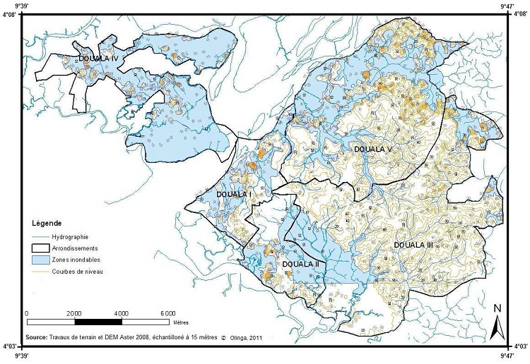 Figure 8 : Répartition des zones inondables dans la ville de Douala (2011)