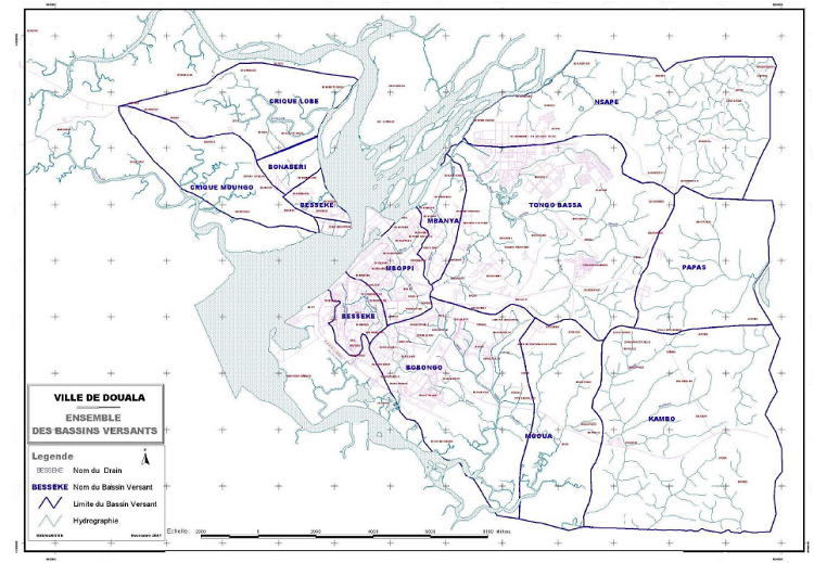 Le réseau hydrographique de la ville s’organise en 9 bassins versants principaux qui sont du Nord au Sud : le Tongo Bassa, le Mbanya, le Mboppi, la Besseké, le Bobongo, le Ngoua, le Longmayangui et le Kambo sur la rive gauche du Wouri et l’Epolo sur la rive droite.