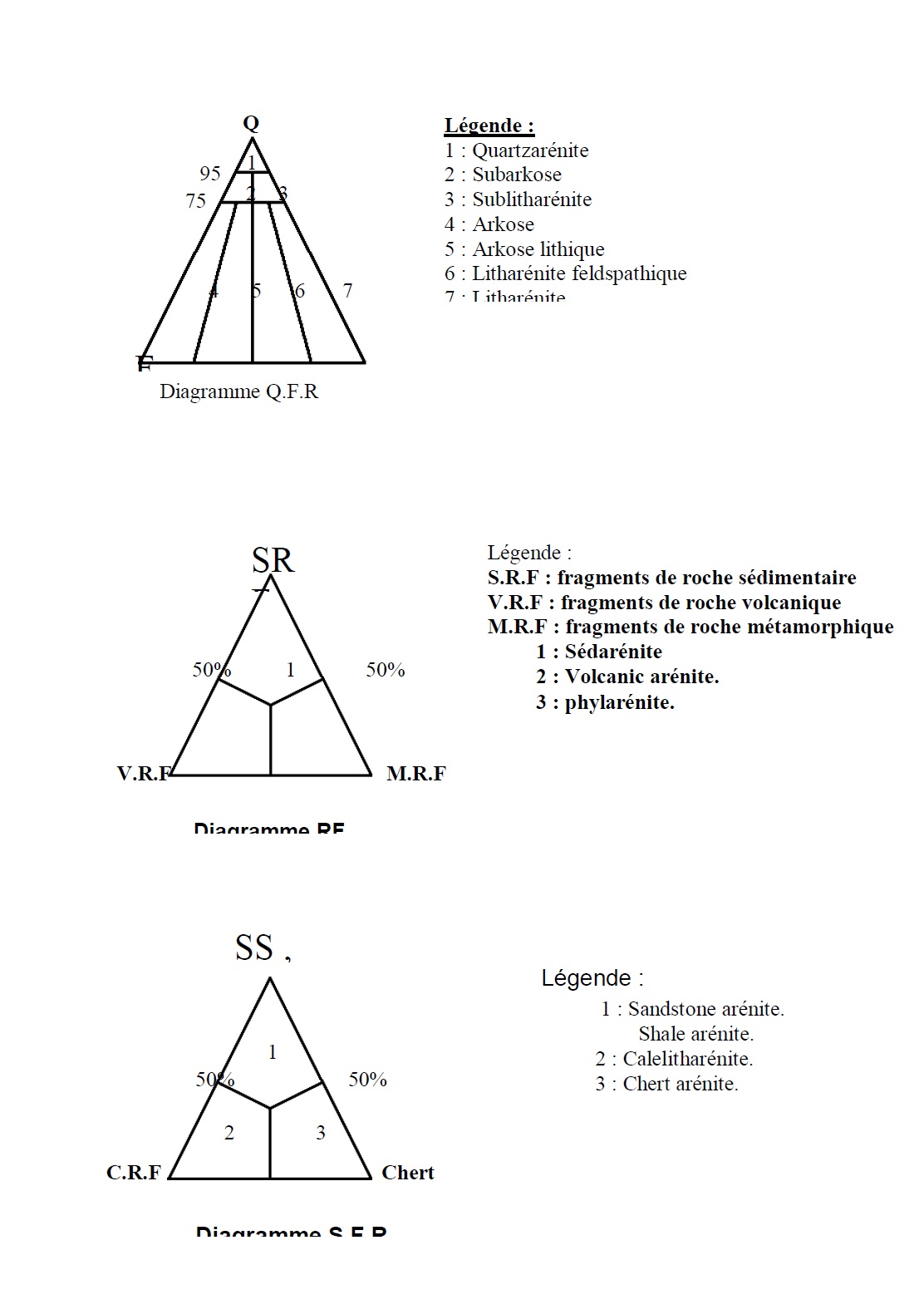 reporter sur le diagramme S.F.R. On détermine alors si la roche est une Chert arénite, calclithite,