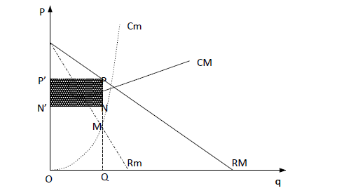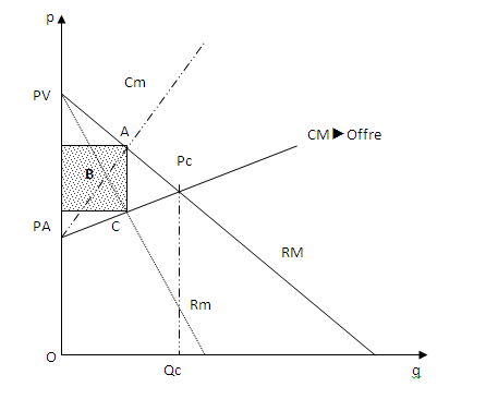 Avant de franchir le point Pc, constatons que les quantités offertes par le producteur sont inférieurs à la demande. Tandis qu’après ce point, on produit à un coût supérieur et la recette moyenne diminue de plus en plus. Ainsi, le producteur en monopole maximise son profit au point Pc, où CM=RM.
