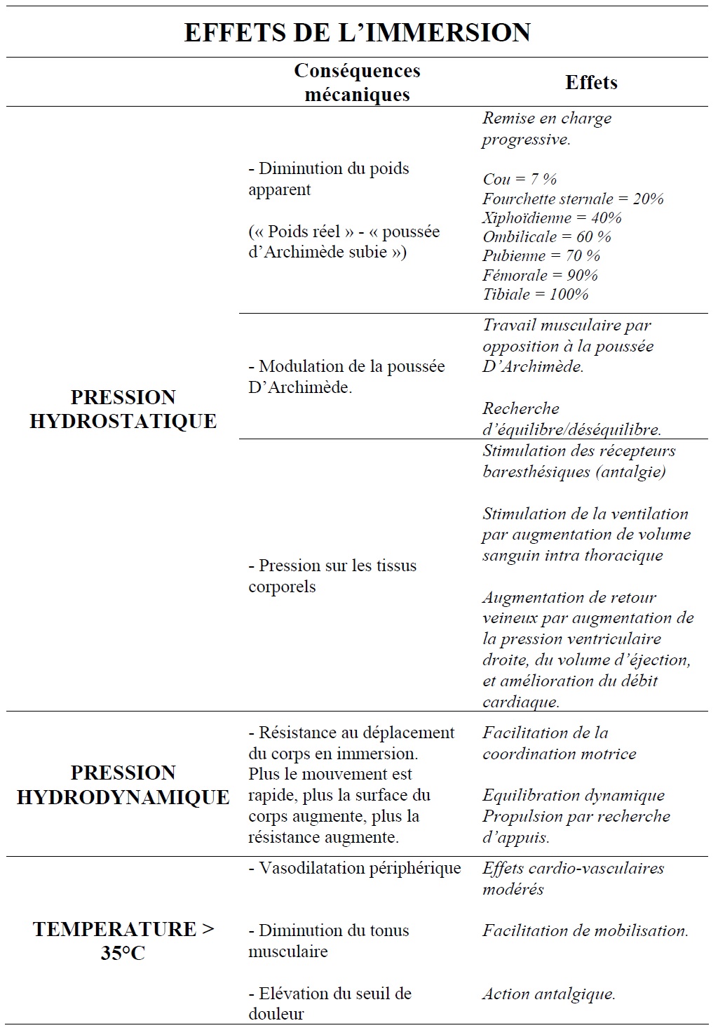 L’immersion induit une diminution apparente du poids du corps, qui permet de travailler sur le pourcentage de remise en charge du poids du corps lors des programmes de rééducation physique.