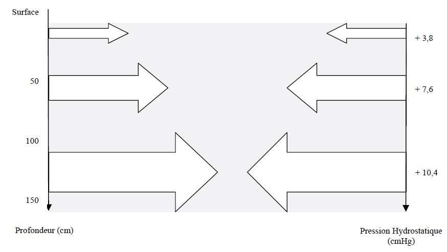 Cette pression augmente avec la profondeur d’immersion, cet hypertension favorise le retour veineux périphérique vers le coeur droit (Badelon, 1994, voir figure 1.). Elle favorise aussi la consolidation osseuse, la cicatrisation des tissus musculaires, et diminue les troubles trophiques. De plus, les travaux de Begin & al (1976) démontrent une stimulation de la ventilation par un accroissement du volume sanguin intra thoracique (de 25 à 36%).