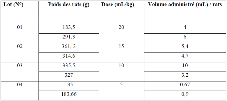 Les rats ont été aléatoirement divisés en quatre groupes, chaque groupe est composé de deux rats. Ces derniers reçoivent des doses déférentes (tableau 08) du gel par gavage comme voie d’administration. Le tableau ci-dessous résume les doses administrées.