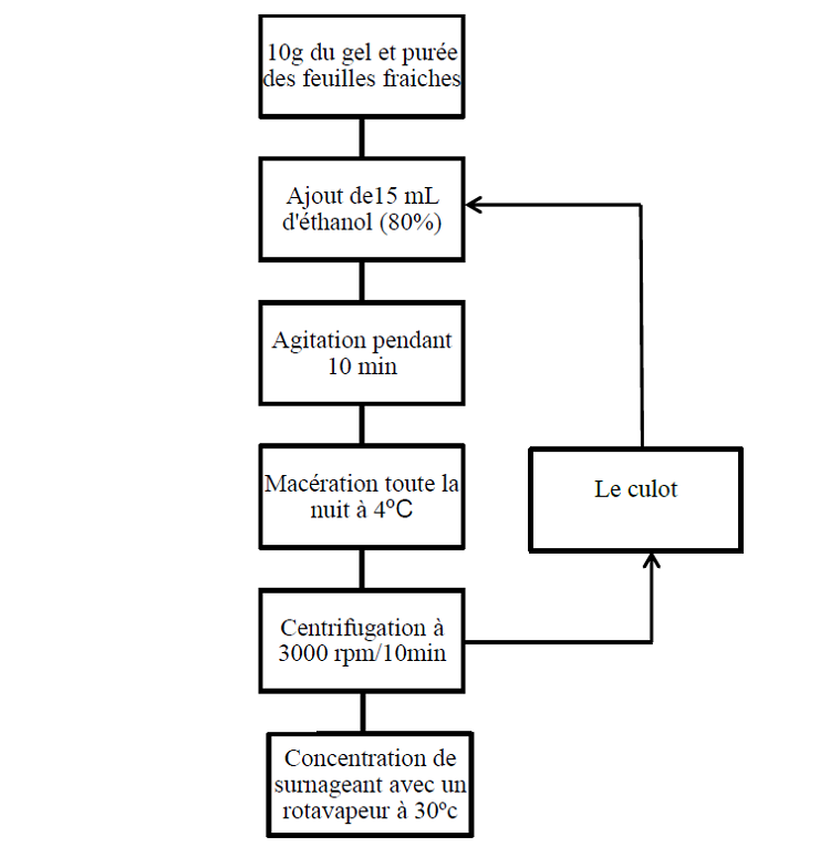 10 g d’échantillon sont mélangés avec 15 mL d’éthanol (80%), puis agités pendant 10 min et laissés macérer toute la nuit à 4ºC, et subis une centrifugation à 3000 rpm /10 min, le surnageant obtenu est concentré à l’aide d’un rotavapeur à 30ºC (figure 11). Cette étape est répétée deux fois. L’extrait obtenu est reconstitué dans l’éthanol (80%) (figure 4).