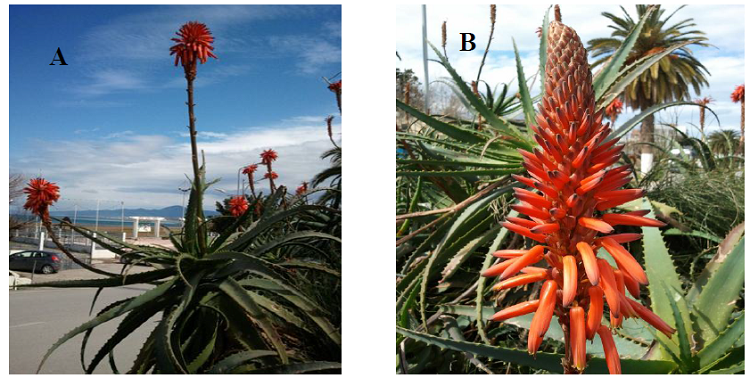 Photo 01 : (A) l’Aloe arborescens, (B) l’inflorescence d’Aloe arborescens