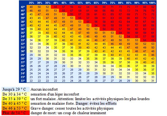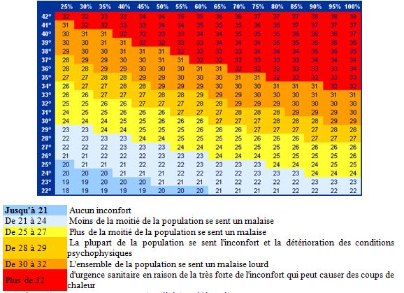 Avec T : température de l’air en °C, et U : humidité relative en %.
