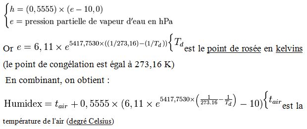 L’ humidex est une mesure utilisée par les météorologistes canadiens pour intégrer les effets combinés de la chaleur et de l’humidité. Il diffère de l’indice de chaleur utilisé aux États-Unis : celui-ci utilise l’humidité relative plutôt que le point de rosée. La formule pour calculer l’humidex est la suivante :