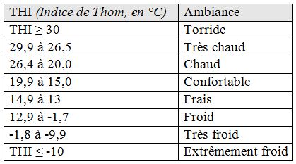 Les ambiances définies par le THI se classent alors selon différents critères (tableau 1).