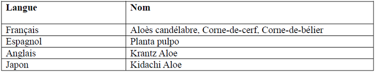 Aloe arborescens a plusieurs noms et appellations dans le monde, le tableau suivant résume les noms les plus connus.