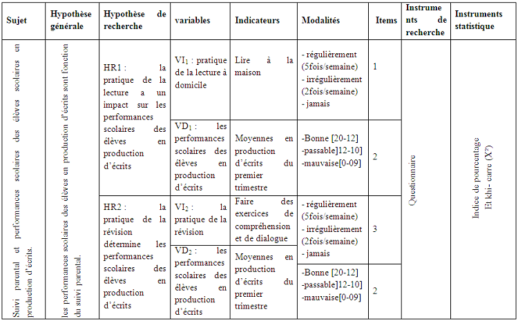 Les hypothèses de notre étude étant formulées, les variables définies, nous allons les présentées dans un tableau appelé tableau synoptique pour faciliter la lecture de celle-ci avec leurs indicateurs et modalités. Ensuite, aborder notre troisième chapitre s’intitulé : METHODOLOGIE.