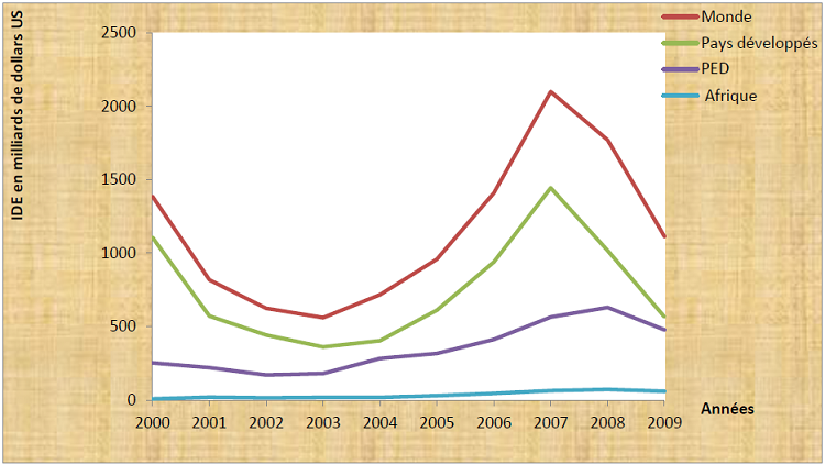 Graphique n°2 : Evolution comparée des IDE mondiaux, des pays développés, des PED et de l’Afrique