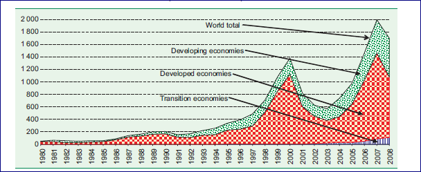 Graphique n°1 : Flux d’IDE entrants mondiaux et par types d’économies, 1980-2008 (milliards de dollars)