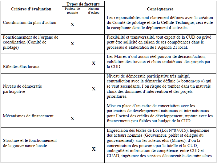 L’analyse du processus d’intégration des préoccupations environnementales et de développement durable dans les politiques locales permet d’identifier les principaux acteurs, leurs rôles et fournie des informations globales sur les probables facteurs de réussite ou de paralysie au plan d’action en cours. Pour se faire, des critères d’évaluation ont été définis, notamment la coordination du plan d’action, le fonctionnement de l’organe de coordination, le rôle des élus locaux, le niveau de démocratie participative(35), les mécanismes de financement puis la structure et le fonctionnement de la gouvernance locale. Ces critères permettent de définir les types de facteurs (de réussite ou d’échec) et les conséquences de chacun d’eux sur la scène locale.