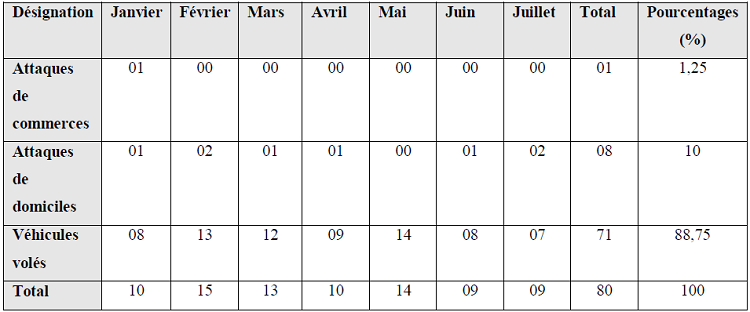 La moyenne générale des infractions sur les sept mois (11,43) met en relief une chute importante de la criminalité, par rapport à la moyenne générale des infractions (17,46) par mois, de 1999 à 2005. C’est donc une réduction de 6 infractions que nous constatons par mois, soit 65,46% de réduction(7).