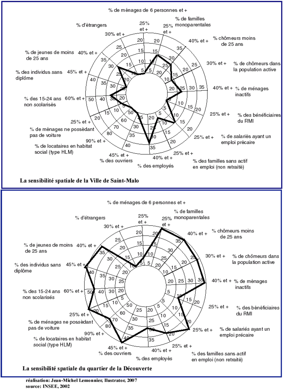 Pour finir, le schéma doit être compris comme une tentative de mesure de la ségrégation d’un territoire, replacé tout d’abord dans un contexte particulier ; ici la ville de Saint-Malo. De plus, la situation démographique et socio-économique des territoires sélectionnés est représentée visuellement de telle sorte que le polygone formé par les différentes liaisons entre indicateurs sur le graphique doit rendre compte du fait que plus la forme géométrique est « décentrée » plus la situation de « ségrégation » est prononcée. Aussi, il ne s’agit pas de considérer ce graphique comme un constat mettant en évidence l’existence « d’une ségrégation » pour le quartier de la Découverte, mais de simplement montrer qu’à l’échelle de la ville celui-ci se différencie…