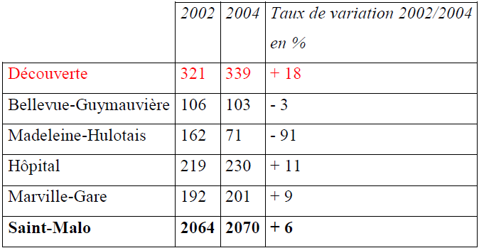 A propos du quartier de la Découverte, les diagnostics relatifs à la vie dans le quartier font état d’un certain nombre de faits qui font sens, si l’on suit les critères fixés institutionnellement pour décrypter la délinquance et les actes d’incivilité. Mais la délinquance sur la commune de Saint-Malo est « diffuse et non concentrée sur le quartier de la Découverte » (Daniel, 2002).