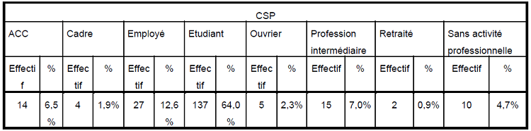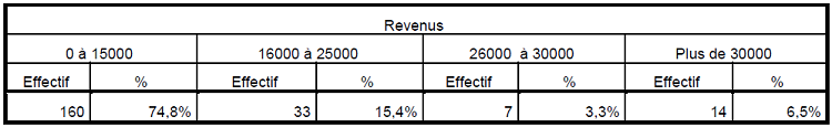 Ce questionnaire a été administré à 214 personnes, les tableaux suivants montrent la répartition par sexe, âge, catégories socio professionnelles et de revenus :