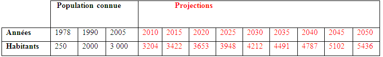 Pour déterminer la population (P3) de 2007 nous adopterons la même démarche en tenant compte du même solde naturel qui est de 12‰. Ainsi de suite jusqu’à obtenir la population de 2050. (Voir tableau suivant)